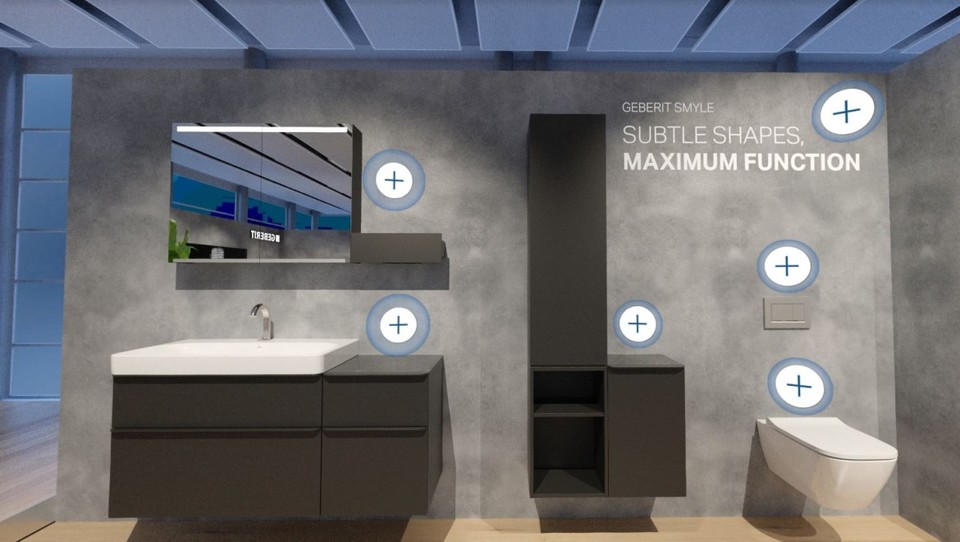 תוכלו למצוא גם את סדרות חדרי האמבט החדשות Geberit Selnova Square, תוספות לסדרות Geberit Smyle, תעלת הניקוז למקלחת CleanLine80 החדשה ולחצני הפעלה רבים מחומרים ומצבעים חדשים. אולם התצוגה הווירטואלי יעורר גם אצלכם השראה בעת מציאת פתרונות BIM